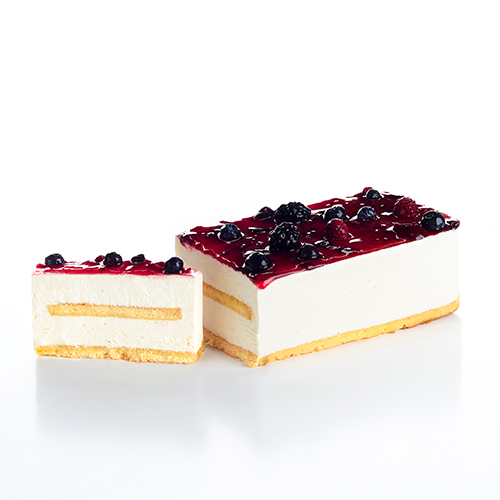 Postre cremoso sabor mascarpone, con bizcochuelo de vainilla y almíbar decorado con pulpa