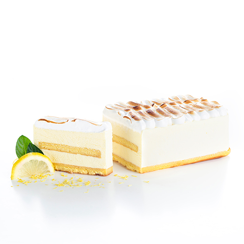 Postre cremoso sabor limón, con bizcochuelo de vainilla y almíbar decorado con merengue
