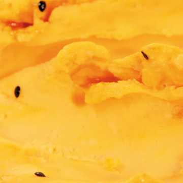 Helado de agua sabor maracuyá, con agregado de pulpa de maracuyá.